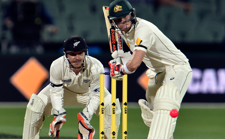 Australia’s batsman Steve Smith plays a shot as New Zealand’s wicketkeeper BJ Watling (L) looks on during the first day-night cricket Test match at the Adelaide Oval. AFP