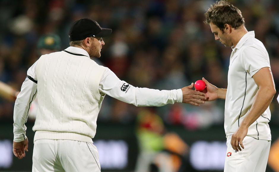 New Zealand’s captain Brendon McCallum, left, hands the pink ball to his bowler New Zealand’s Doug Bracewell during their cricket test in Adelaide, Friday, Nov. 27, 2015. This match is the sport’s first ever day-night test and the use of the “experimental” pink leather ball replacing the standard-issue red for the first time in a format that dates back to the 1870s. AP