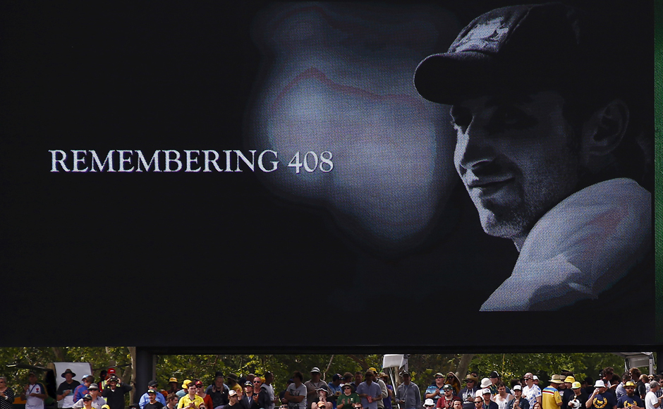 A tribute to former Australian cricketer Phillip Hughes, who was the 408th player for Australia, is displayed on a screen during the first day of the third cricket test match between Australia and New Zealand at the Adelaide Oval in South Australia, November 27, 2015. The third and final match of Australia’s home series against New Zealand promises to push test cricket into a brave, new world but players on both sides will also look back in sorrow a year after the tragic death of batsman Phillip Hughes. Friday’s opening day of the first day-night test match falls a year to the day that Hughes died in a Sydney hospital at the age of 25 from a serious head injury, having been struck in the head by a bouncer during a domestic match. Reuters