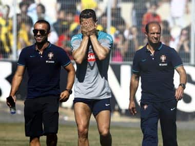Campinas, Brazil: Cristiano Ronaldo cut short a training session with Portugal on Thursday, leaving the field with an ice pack over his left knee — indicating that his tendinitis may still be bothering the star forward. Ronaldo trained with the rest of the team for about 15-20 minutes doing physical exercises but then did not take part in the rest of the session with full ball drills. [caption id=“attachment_1569279” align=“alignleft” width=“380”]  Portugal’s Cristiano Ronaldo covers his face as he walks between team members during a team training session in Campinas. Reuters[/caption] Instead, he stretched on his own and signed a few shirts for fans before going to sit on the bench. When he left, he had an ice pack over his left knee. Ronaldo has been bothered by left leg injuries ahead of the World Cup, and was sidelined for two weeks with tendinitis in the knee and a thigh problem. However, Portugual midfielder Joao Moutinho said there was nothing to worry about concerning Ronaldo’s health. “Ever since he started to train with us he has been 100 percent like the rest of us,” Moutinho said. “Everything is fine with him but there is some caution, not only with him. Today many other players were using ice as well. There is nothing to worry about. The ice is normal after training.” AP