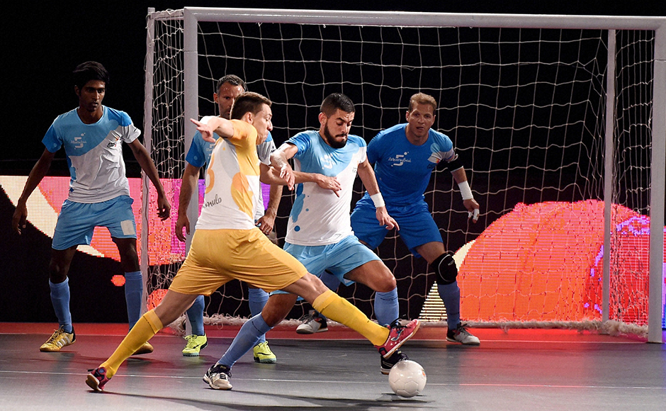 Falcao, from the Chennai 5’s plays against the Mumbai 5’s during their Premier Futsal match. AFP