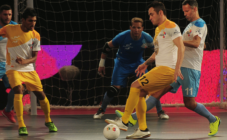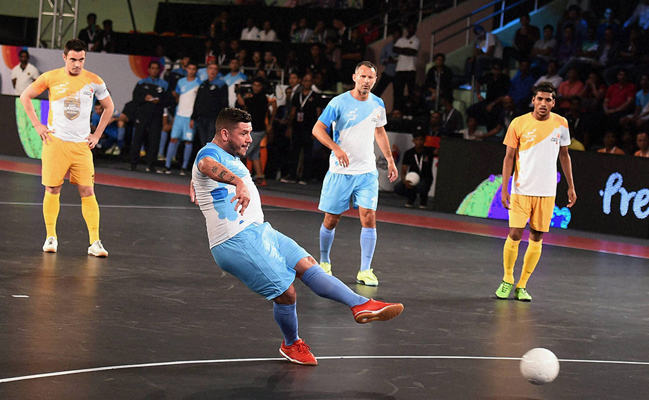 Mumbai 5’s futsal player Adriano Foglia hits a goal against Chennai 5’s (yellow) during their match in Chennai. PTI