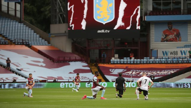 Manchester: Players kneeled in support of the Black Lives Matter movement and victims of the coronavirus were remembered as the Premier League made a somber return on Wednesday from a 100-day shutdown that deprived England of its national sport. Back on the sideline at Manchester City was Arsenal manager Mikel Arteta, whose positive COVID-19 test in March led to the longest suspension of the top-flight competition since World War II. Fans are still prohibited from attending stadiums. [caption id=“attachment_8495771” align=“alignleft” width=“380”]  Aston Villa, Sheffield United players and match referee took a knee before restart of Premier League to express support for anti-racism protests. AP[/caption] Britain is still trying to contain one of the world’s worst outbreaks of the coronavirus while also convulsed by a reckoning over racial injustice that roused the campaigning passion and anger of Premier League players following the death of George Floyd. “I’m embarrassed, I am ashamed for what white people have done to black people,” Manchester City manager Pep Guardiola said. “We have to do a lot of things for black people we have not done so far.” The message “Black Lives Matter” replaced player names on jerseys during City’s 3-0 victory over Arsenal and Aston Villa’s 0-0 draw with Sheffield United. The symbolic move that will continue in this weekend’s round of games is being accompanied by demands from players for substantive changes to end discrimination and promote diversity. After the opening whistle blew in the first game at Villa Park, every player took a knee in a tribute to Floyd, who was killed by a policeman in Minneapolis last month. In Manchester, the same gesture took place just before kickoff.
