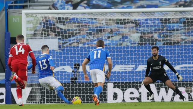 London: Jurgen Klopp again fumed at a “dangerous” schedule as Liverpool had two goals disallowed and conceded two penalties in a 1-1 draw at Brighton, while Man City clicked back into gear with a 5-0 thrashing of Burnley. Liverpool edged back to the top of the Premier League table, a point ahead of Tottenham, but were left frustrated by Pascal Gross’s stoppage-time penalty which salvaged a point for Brighton. Klopp had voiced his displeasure all week at facing a lunchtime kick-off just three days after a Champions League defeat to Atalanta. Already hit by a huge list of injuries, the Reds suffered another setback when James Milner had to be replaced with a hamstring problem in the second-half. “Congratulations,” Klopp said sarcastically to a television reporter for BT Sport. “You work for them yeah? Hamstring, surprise. “I’ve not had a go at the broadcaster, I just say how it is. After Wednesday, Saturday 12.30 is really dangerous for the players.” Klopp named Neco Williams and Nathaniel Phillips in a makeshift back four and Brighton took advantage when Williams wiped out Aaron Connolly for Brighton’s first spot-kick, but Neal Maupay sent it wide. Mohamed Salah was then denied an opener by VAR for offside but the Egyptian teed up Diogo Jota to keep his flying start to life at Liverpool going with a fine finish on the hour mark. Sadio Mane had a second for the visitors ruled out for offside before another VAR review went against Liverpool when Andy Robertson was adjudged to have kicked Danny Welbeck trying to clear. This time Gross took responsibility from the spot and sent Alisson Becker the wrong way. Mahrez hits hat-trick City shrugged off their problems in front of goal by hitting five past Burnley for the fourth consecutive clash between the two at the Etihad. Pep Guardiola’s men had scored just seven goals in their previous seven league games, but Riyad Mahrez’s early double opened the floodgates. Benjamin Mendy made it 3-0 before half-time and Ferran Torres got his first Premier League goal before Mahrez completed the scoring and his hat-trick. Victory propelled City to within six points of Liverpool at the top of the table with a game in hand. “It’s important for us to score goals and keep going,” said Guardiola, who will hope a favourable run of fixtures over the next month can haul his side back into the title race. Maradona remembered Sergio Aguero was not involved for City, but Guardiola confirmed that was due to a small injury problem rather than his close family connection to Diego Maradona, who died aged 60 on Wednesday. Aguero was previously married to and had a child with Maradona’s daughter Giannina. Everton boss Carlo Ancelotti was reduced to tears before his side’s 1-0 loss to Leeds as respects were paid to Maradona before all Premier League games this weekend with a minute’s applause. [caption id=“attachment_9063441” align=“alignnone” width=“640”]  Leeds United’s Raphinha celebrates after scoring the opening goal against Everton. AP[/caption] An enthralling 90 minutes followed at Goodison Park with chances aplenty for both sides but just one goal, scored by Raphinha 11 minutes from time. James Rodriguez and Richarlison had strikes ruled out for offside before the break, while Dominic Calvert-Lewin dragged a big chance wide for Everton early in the second-half. Leeds, who had the majority of the chances, finally made the breakthrough when Raphinha arrowed a low left-footed shot into the bottom corner for his first goal since joining the club in August. “He is a player who has adapted very quickly to the Premier League,” said Leeds boss Marcelo Bielsa. “He is a player who moves all around and has the capacity to unbalance defences.” Leeds move up to 11th, while a fourth defeat in five games leaves Everton still in sixth. West Brom claimed their first win back in the top-flight as Connor Gallagher’s strike earned a 1-0 win over Sheffield United. Victory took Slaven Bilic’s men out of the bottom three, while the Blades remain rooted to the foot of the table with just one point from 10 games.