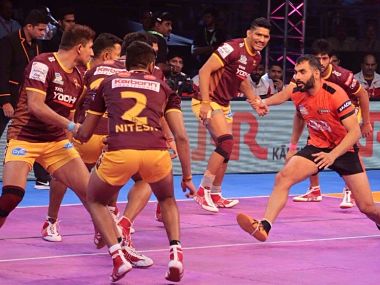 Lucknow: U Mumba bounced back in style to beat UP Yoddha 37-34 in the opening tie of the Lucknow leg of the Pro Kabaddi League’s (PKL) fifth season at the Babu Banarasi Das Indoor Stadium on Friday. The first half of the tie witnessed domination by the home side before the visitors clawed back, thanks to Shabeer Bapu’s 13-raid points and skipper Anup Kumar’s eight points. Rishank Devadiga scored 14 points for UP Yoddha but it wasn’t enough for the home side to get over the line in their maiden home encounter. [caption id=“attachment_3948051” align=“alignleft” width=“380”] U Mumba captain Anup Kumar in action. Image Courtesy: PKL official website[/caption] Skipper Nitin Tomar gave the hosts a perfect start with the first raid of the match, before young gun Rishank Devadiga came up with a stunning piece of play to add three more points and make it 4-0. The visitors opened their account, thanks to star raider and Mumba skipper Anup Kumar’s successful raid point. But Tomar gained another raid point for the hosts as U.P. lead by 5-1 before Rishank extended their lead to 6-2. An all-out was inflicted on U Mumba in the ninth minute as they trailed 4-12. The visitors, on a comeback trail, took down Rishank and Mahesh Goud while Shabeer Bapu made it a two point game by winning a touch point during his raid. Shabeer once again starred for the visitors, by getting rid of two Yoddha defenders during his raid as Mumba trailed by just 3 points at the break. After the break U Mumba bounced back strongly as they inflicted an all-out in the first minute to level the game at 16-16. U Mumba stretched their lead to 19-17 in the 22nd minute as they sent Tomar to the bench. Rishank scored two points for UP as they led 20-19 after 25 minutes. Rishank scored three points in the 26th minute as UP led 23-22 but Darshan Kadian responded with a two-point raid in the next minute to get the lead back for the visiting side. UP Yoddha then inflicted the second all-out in the 30th minute to lead 29-26. But Shabeer with his 11th point of the match in the 32nd minute helped U Mumba reduce the gap to 28-31. Darshan got another two-point raid in the 34th minute as U Mumba levelled the match at 31-31. With less than five minutes to go, U Mumba inflicted their second all-out to lead 35-31. UP Yoddha cut the deficit to two points as they trailed 33-35 after 37 minutes even as U Mumba held their nerves in the final two minutes of the match to clinch the tie 37-34. In the second tie of the day, Jaipur Pink Panthers pipped Bengaluru Bulls 30-28 in a thrilling match. Jaipur rode on terrific raids from Jasvir Singh (10 points) and a rock-solid defensive display from birthday boy Manjeet Chhillar (8) to hold their nerve and gain a much-needed win. It was Jaipur Pink Panthers’ second win of the campaign whereas Bengaluru Bulls crashed to their fifth defeat. Jaipur began strongly as they led 5-2 after minutes with their defence inflicting damage on Bengaluru raiders. Bengaluru were a bit slow to begin with but star raider Rohit Kumar brought them back into the game with a do-or-die raid in the 15th minute to draw level at 8-8. Bengaluru inflicted an all-out in the next minute as Rohit scored two more points to give his team a 12-8 lead. Thereafter, Jasvir came with up an incredible super raid in the 16th minute as Jaipur made it 11-12 before sharing the spoils at 12-12 in the 19th minute. Jaipur immediately forced an all-out in the 20th minute to go into the break leading 17-14. Coming back, Jasvir scored his eighth raid point in the 23rd minute as Jaipur led 19-14, before Manjeet attained a high-five to stretch their lead to 21-14 after 27 minutes. Jaipur inflicted another all-out in the 29th minute to lead 26-16 to dominate the first 10 minutes of the second half. Bengaluru’s defence managed just four tackle points in the first 30 minutes of the match. Two tackle points by Bengaluru reduced the deficit to eight points as they trailed 20-27 after 34 minutes. In the last five minutes, Bengaluru’s challenge was to reduce the defeat margin to seven or less points to which Ajay Kumar responded with a raid point in the 39th minute to trail 23-29. Jaipur were reduced to just one man as Bengaluru launched a comeback and trailed 25-29. Towards the end, Bengaluru inflicted an all-out to reduce the deficit to just one point but Jaipur survived a scare, thanks to Jasvir’s raid point in the last second of the match to win 30-28.