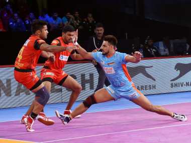 Pune: Bengal Warriors produced a memorable comeback to beat Bengaluru Bulls 44-37 in Pro Kabaddi League in Pune on Thursday. Maninder Singh was the star man for Bengal Warriors as he scored 17 raid points to lead his team to victory. Ravindra Ramesh also chipped in with eight crucial points for the winning team. Bengal Warriors trailed by 7 points after the first half but inflicted three all-outs in 12 minutes to complete a brilliant comeback. Bengal Warriors defence also had a strong game in the second half to contain the Bengaluru raiders. Bengaluru Bulls are winless against Bengal Warriors this season in the Pro Kabaddi League. [caption id=“attachment_5643671” align=“alignleft” width=“380”] Maninder Singh scored 17 raid points to help Bengal Warriors beat Bengaluru Bulls. Image Courtesy> PKL[/caption] Rohit Kumar and Pawan Sehrawat began brightly to give Bengal Warriors a 4-2 lead in the fifth minute. Bengal Warriors’ reliance on Maninder Singh was getting exposed as he was the lone scorer for them in the first seven minutes of the match. Bengaluru Bulls inflicted the first all-out of the match in the 7th minute to lead 10-2. Maninder Singh scored his third raid point in the 10th minute as Bengal Warriors trailed 3-13. Ravindra Ramesh made a two-point raid to reduce the deficit to nine points for Bengal Warriors. It took Bengal Warriors 18 minutes to score their first tackle point of the match. Bengal Warriors ended the first half strongly as they reduced Bengaluru Bulls to just two men and trailed 12-19. The Warriors inflicted an all-out in the 22nd minute to trail 16-21. Bengal continued to get points as their defence got their act together and Maninder picked up the raid points. The deficit was reduced to just two points after 23 minutes and Bengal Warriors looked in ascendancy. Bengaluru Bulls were looking in disarray as they were on the verge of suffering another all out in the 25th minute. Bengal Warriors took the lead for the first time in the second half. Another all out was inflicted by Bengal Warriors in the 27th minute as they led 27-24. Maninder Singh’s brilliant super raid in the 31st minute once again reduced Bengaluru Bulls to two men. A two-point raid in the next minute by Maninder Singh led to another all out meant Bengal Warriors led 38-28. Rohit Kumar attempted to revive Bengaluru Bulls with a couple of raid points but it wasn’t enough in the end. Gujarat thump Pune to continue amazing run Gujarat Fortunegiants showed why they are the team to beat as they registered a comfortable 35-20 win over Puneri Paltan in Pune on Thursday. Sachin (7 points) and Prapanjan (5 points) combined to scored 12 raid points while Gujarat’s defence scored 14 tackle points and contained Pune’s raiders. Puneri Paltan’s raiders had a quiet match and that was the biggest reason of their downfall. Sandeep Narwal got a high five for Puneri Paltan. Gujarat Fortunegiants were top of the table in Zone A with 63 points from 15 matches while Puneri Paltan were third with 47 points from 18 matches. Puneri Paltan got off to a quick start as they scored a raid and tackle point to lead 2-0. Gujarat Fortunegiants levelled the match at 2-2 in the second minute. After five minutes of play both teams were neck and neck and it was 5-5. Gujarat’s strong defensive unit came to the fore once again as they scored a couple of tackle points to open a four-point lead. Things got worse for Puneri Paltan as they suffered an all out in the 11th minute. Gujarat Fortunegiants finished the first half strongly as they held a 9-point lead with the score reading 20-11. Puneri Paltan, fresh after a strong comeback in their last match, tried to repeat the feat but Gujarat’s defence was solid as rock. With inputs from PTI