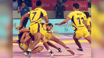 File picture of Telugu Titans players in action. PTI[/caption] He had splendid support from Rohit Baliyan 8 (7 raid and 1 bonus) and Prashant Rai 9 (8 raid and 1 bonus) points. The winners were 20-12 up at half-time with one all-out scored in the 15th minute. U Mumba, who had won yesterday against Puneri Paltan were not able to get their act going though they tried to keep pace with their rivals up to 9-9. This was possible due to the efforts of Captain Pradeep Kumar and Bhupender who had four and two points to their credit. U Mumba faded after the break as Prashant Rai and Rohit Baliyan stepped up the gas and a few failed attempts by the rival defence especially Anoop E V and Jeeva Gopal led to the Titans opening up a lead of 32-18 with a second all-out. Iran?s captain Fazel Atrachali showed some promise initially by super tackling rival Prashant Rai but he could not replicate that thereafter. Prashant came up with a super raid of three at that time. Pradeep kept on trying till the end and was rewarded with a super raid late in the match. This one only helped reduce the margin by three to 23-39. Sandeep the youngster made a few amends in the end by making some clean tackles. In the end it was the Titans who proved to be the better of the two. PTI