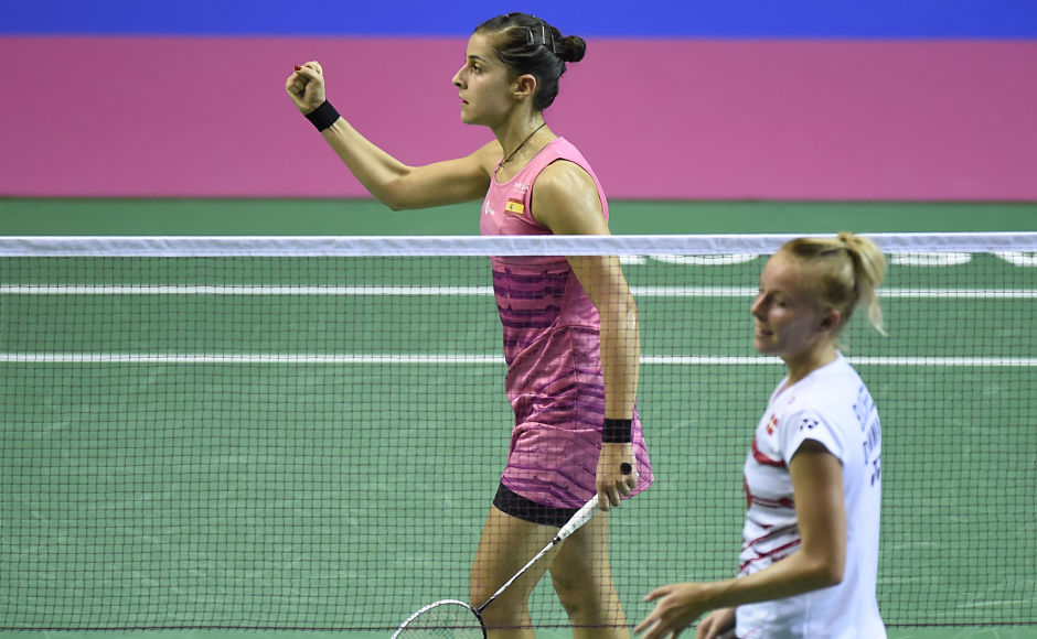 Spain’s Carolina Marin moved one step closer to securing a medal after beating Denmark’s Mia Blichfeldt 21-7, 21-11. AFP
