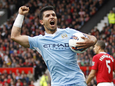Manchester: Manchester City crushed Manchester United 6-1 for their biggest win at Old Trafford for 56 years to go five points clear of the champions at the top of the Premier League on Sunday. Mario Balotelli and late substitute Edin Dzeko scored twice each while Sergio Aguero and David Silva added the others with three of City’s goals coming in the last four minutes of the match. United’s defence, without Jonny Evans after he was sent off after 47 minutes, simply could not cope with the rampaging visitors. [caption id=“attachment_115059” align=“alignleft” width=“380” caption=“Manchester City’s Sergio Aguero celebrates after scoring against Manchester United during their English Premier League soccer match at Old Trafford in Manchester. Reuters”]