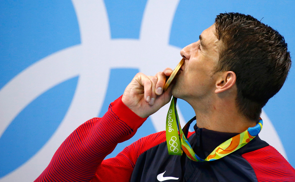 USA’s Michael Phelps kisses his first Olympic gold medal at Rio 2016, his 19th overall. Reuters