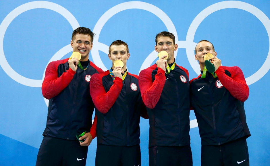 Michael Phelps, Caeleb Dressel, Nathan Adrian and Ryan Held of USA pose with their gold medals after winning the men’s 400m freestyle relay. Reuters