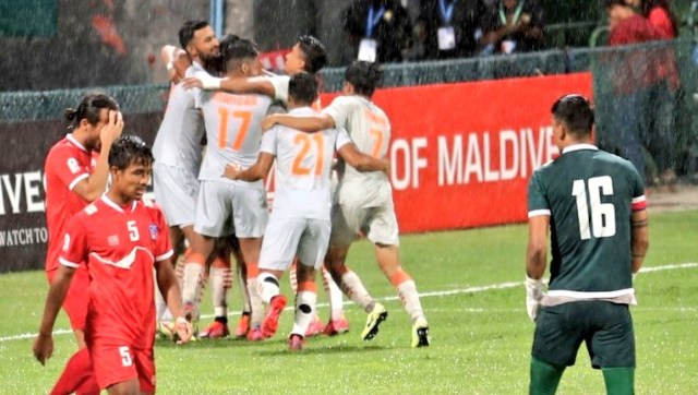 Male, Maldives: Talisman Sunil Chhetri equalled the iconic Lionel Messi with his 80th international strike as an inspired India blanked Nepal 3-0 for their eighth SAFF Championship title in Male on Saturday. India extended their domination in the regional tournament thanks to second half goals from Chhetri (49th minute), Suresh Singh (50th) and Sahal Abdul Samad (90th). With his strike, the 37-year-old Chhetri equalled Messi and became the second highest gaol-scorer in international football among active players. Suresh Singh and Sahal then added to the tally and paved the way for India’s title triumph, a much-needed one after a series of mediocre outings. Sahal made it 3-0 when he dribbled past a few defenders after receiving the ball on the left flank at the stroke of the final whistle. India dominated possession in the first-half but failed to break the deadlock. However, Chhetri put India ahead minutes into the second half and even before Nepal could down settle down, Suresh made it 2-0. This is the Indian football team’s first title triumph under head coach Igor Stimac, who faced criticism in recent times for his side’s inability to win enough games. However, when it mattered the most in this edition of the regional tournament, Stimac’s players delivered the results the team’s fans had been waiting for. Stimac also became the third foreign coach after Jiri Pesek (1993) and Stephen Constantine (2015) to clinch the title with the Indian team. Chhetri gave India the lead after he charged in to neatly head in a delivery from Pritam Kotal on the right flank, leaving the Nepalese goalkeeper with no chance to come to his team’s rescue. Barely a minute after Chhetri’s opener, another attack by India caught Nepal completely off-guard as Suresh found the back of the net after Yasir Mohammad brilliantly cut it back for the mid-fielder. Their tails up after two quick strikes, India pressed hard for more but could not add to the tally for a while before Sahal found the back of the net with his solo effort. Before Sahal’s strike, there was a chance for Manvir Singh in the 52nd minute after he was played through, but his left-footed effort was blocked. In the 79th minute, there was great chance for Udanta Singh as he was in the clear to take a crack at goal but Rohit Chand came up with a fine block to deny the Indian winger.