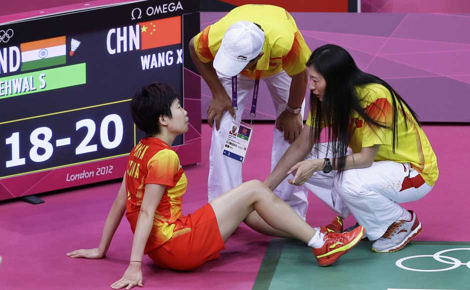 hina’s Wang Xin is looked at by team officials as she sits down in pain while playing against India’s Saina Nehwal in a women’s singles badminton bronze medal match. China’s coach, and twice Olympics champion for Badminton, Zhang Ning (R) is also seen. Saurabh Das/AP[/caption] [caption id=“attachment_405359” align=“alignleft” width=“940”]