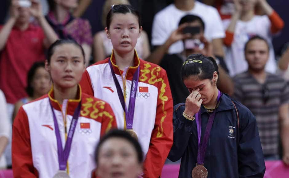 Saina Nehwal, right, fights back tears as she stands at themedal podium for winning bronze in women’s singles badminton of the 2012 Summer Olympics, in London. On the left is China’s Wang Yihan and center is China’s Li Xuerui. Saurabh Das/AP[/caption] [caption id=“attachment_405361” align=“alignleft” width=“940”]