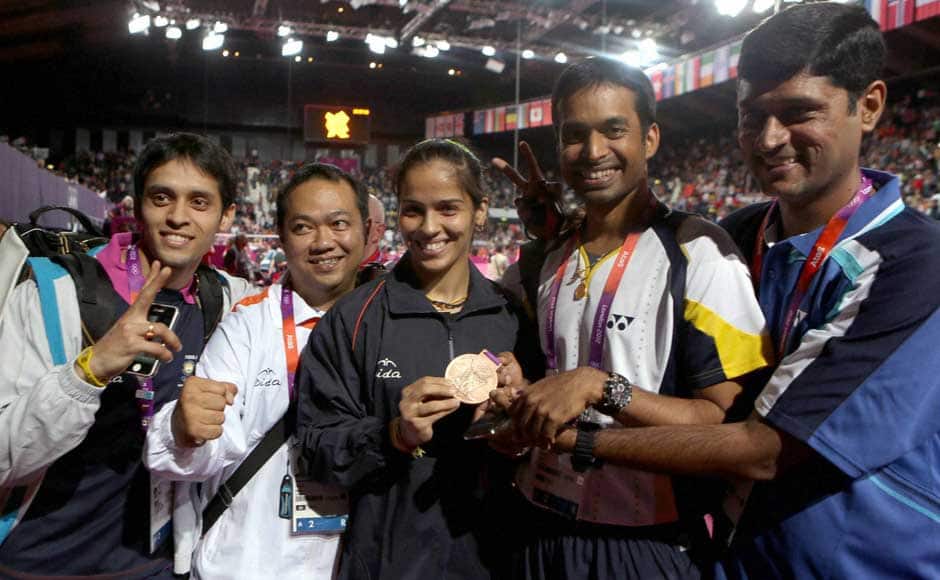 Big moment for Saina and her entire team: Bronze medal winner India’s Saina Nehwal with team coach P Gopichand and player Kashyap (L) after medal ceremony at Wembley Arena. PTI[/caption]