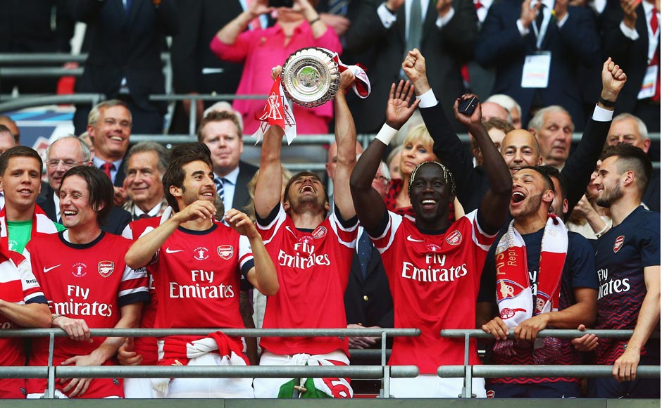 Winning goalscorer Aaron Ramsey of Arsenal (C) lifts the trophy in celebration after the FA Cup with Budweiser Final match between Arsenal and Hull City at Wembley Stadium on May 17, 2014. Arsenal ended a nine-year trophy drought with the win. Getty Images