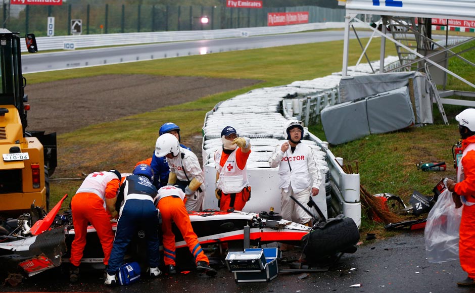 Jules Bianchi of France and Marussia receives urgent medical treatment after crashing during the Japanese Formula One Grand Prix at Suzuka Circuit on October 5, 2014 in Suzuka, Japan. Getty Images