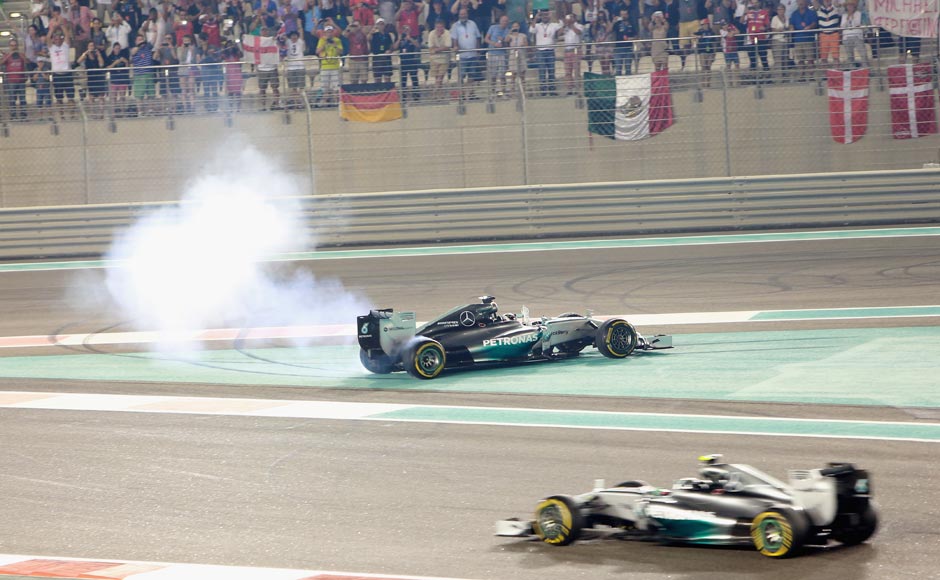 Lewis Hamilton of Great Britain and Mercedes GP celebrates in the car as Nico Rosberg of Germany and Mercedes GP drives by after winning the World Championship and the Abu Dhabi Formula One Grand Prix at Yas Marina Circuit on November 23, 2014 in Abu Dhabi, United Arab Emirates. Hamilton was eventually crowned champion. Getty Images
