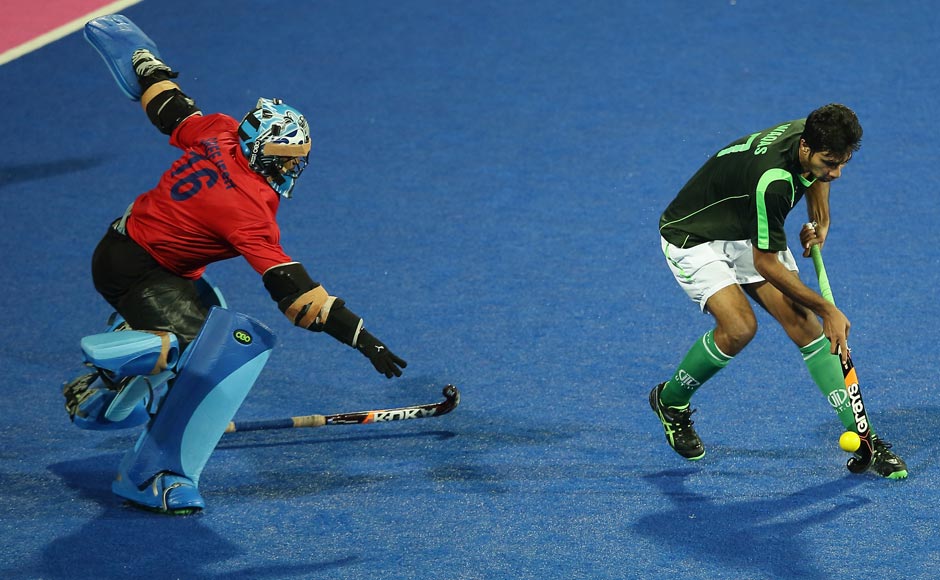 Muhammad Waqas of Pakistan (R) tries to get past Sreejesh Parattu Raveendran of India during the penalty shootout in the men’s hockey gold medal match on day thirteen of the 2014 Asian Games between India and Pakistan at Seonhak Hocky Stadium on October 2, 2014 in Incheon, South Korea. India won the match. Getty Images