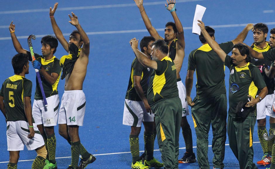 Pakistan’s Muhammad Tousiq. second left, makes an obscene gesture towards the crowd as his teammates celebrate their victory over India in the Champions Trophy field hockey semifinal match in Bhubaneswar, India.Pakistan players Muhammad Tousiq and Ali Amjad have been handed one-match bans for their celebrations following the 4-3 win over India. The FIH investigated the matter and made the announcement Sunday after initially refusing to take action despite terming the behavior as “beyond acceptable standards.” AP