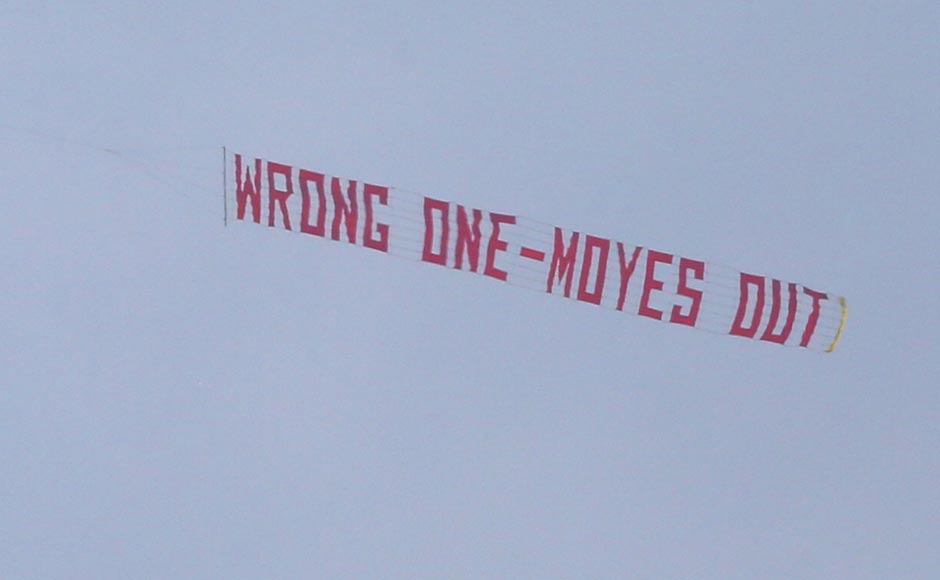 A plane flies overhead with a banner criticising Manchester United Manager David Moyes during the Barclays Premier League match between Manchester United and Aston Villa at Old Trafford on March 29, 2014 in Manchester, England. Moyes was sacked after a few games. Getty Images