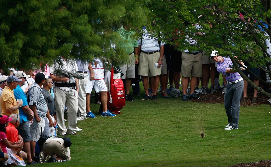 Rory McIlroy of Northern Ireland plays a shot from the rough on the first hole during the first round of the TOUR Championship by Coca-Cola at the East Lake Golf Club on September 11, 2014 in Atlanta, Georgia.The ball deflected into a spectator’s pocket and McIlroy refused to take it from there, opting for a drop ball. Getty Images