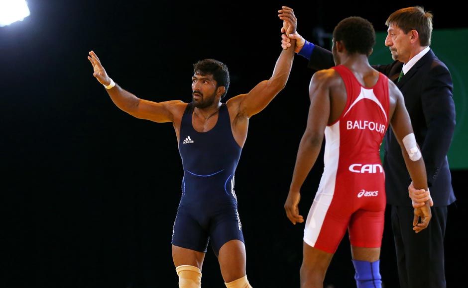 Yogeshwar Dutt (L) of India celebrates victory in the Men’s FS 65 kg Gold medal match against Jevon Balfour of Canada at Scottish Exhibition and Conference Centre during day eight of the Glasgow 2014 Commonwealth Games on July 31, 2014. Getty Images