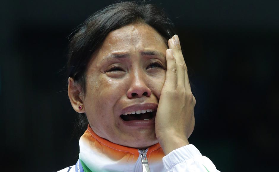 Sarita Devi of India cries after she refused her bronze medal during the medal ceremony in the Womens Light Division Final on day twelve of the 2014 Asian Games at Seonhak Gymnasium on October 1, 2014 in Incheon, South Korea. Getty Images