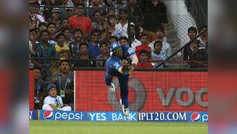 Kieron Pollard took arguably the catch of the tournament. BCCI[/caption] Royals’ team management’s baffling decision to rest the performing trio of Ajinkya Rahane, Pravin Tambe and Steven Smith backfired as the team lost the necessary momentum going into the match. Royals with 14 points from 12 games remain third in the table and firmly in the hunt. But back-to-back losses will certainly affect their chances of finishing in the top two which would have given them an additional game. Mumbai now have eight points from 11 matches. Unmukt Chand (2) finally got a game but could well be the last one in the tournament. It was a rank bad delivery from Pragyan Ojha and Unmukt failed in his bid to play a proper pull-shot as Mike Hussey made no mistake om the deep mid-wicket boundary. Shane Watson (5) did not get going as he misjudged the turn off an Ojha delivery and the ball ballooned up hitting the toe-end of the bat for Ambati Rayudu to take a simple catch at mid-on. Sanju Samson (2) also played early to a Krishmar Santokie slower as Rayudu got his second catch as Royals were reduced to 42 for three. While Karun was playing his strokes at other end, Kevon Cooper was dismissed by a sheer piece of fielding brilliance from Kieron Pollard standing at the long-on boundary. Cooper hit a Harbhajan delivery which would have been a sure six had any other fielder save Pollard been manning that area. The giant West Indian timed his jump to perfection as he plucked a one-handed catch but the momentum was forcing him over the ropes. He kept his balance and threw the ball inside. He then turned in a flash to dive in front and completed a stunner as Cooper looked shell-shocked. At 61 for four, leggie Shreyash Gopal playing his first game was brought into operation. He accounted for Ankit Sharma and Stuart Binny in quick succession to ensure that there was no comeback for the Royals. Karun’s fight ended when he was holed out off a Harbhajan Singh delivery caught by Krishmar Santokie. At the end of 12 overs, Royals were reeling at 75 for seven. Faulkner and Hodge did try but there was too much to do in the end. Earlier, Mumbai Indians top-order fired in one of the rare occasions as they put up a competitive 178 for three due to a century-plus opening stand between Mike Hussey and Lendl Simons. Comeback man Hussey (56) and Simons (62) put on 120 runs for the opening stand, which incidentally was the first three-figure partnership for MI in 30 games. The last time MI had a century stand was when Sachin Tendulkar and Dwayne Smith conjured 163 runs against the same opposition during the 2012 edition. Hussey scored his runs in 39 balls with three fours and two sixes while Simons took 51 balls, which included six fours and two sixes. Skipper Rohit Sharma showed his big-hitting prowess during a 19-ball cameo that fetched him 40 runs with three fours and four sixes. Rohit and a subdued Kieron Pollard (14 no) added 56 for the third wicket in five overs. Hussey and Simons started cautiously trying to get a measure of the slow Motera track. Hussey, coming back to the team after a disastrous UAE leg, looked confident as he played some fluent drives and cuts peppering the in-field. Simons also proved to be an able partner as he started slowly but picked up the pace as time progressed. Both ran well between the wickets converting a couple of singles into twos. MI’s opening stand yielded 50 runs in 6.4 overs with Simons racing to 30. When Faulkner dropped one short, Hussey was quickly on backfoot to pull it in front of square for a six. Hussey’s second six was a slog sweep off left-arm spinner Ankit Sharma into the mid-wicket stands. Simons also joined the fun as he lofted an ultra-slow delivery from Rajat Bhatia into the deep mid-wicket stands while lofting Kevon Cooper over long-off for his second six. Hussey was the first to reach the half-century of 32 balls while Simons took 43 balls to attain the individual landmark. Their 100-run partnership, MI’s first of the season came in the 13th over. PTI