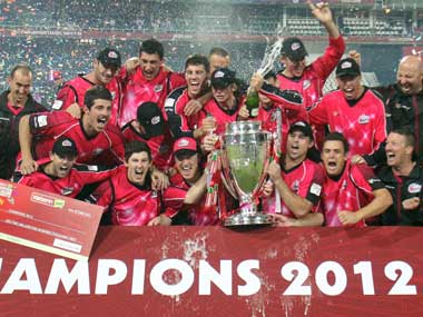 Johannesburg: Sydney Sixers produced an all-round clinical display to clinch the Champions League Twenty20 title with a dominating 10-wicket victory over Highveld Lions in a lop-sided summit clash here last night. The Sixers first rode on a brilliant bowling display by spinner Nathan McCullum (3/24) and pacer Josh Hazlewood (3/22) to dismiss Highveld Lions for a modest 121 in their stipulated 20 overs after winning the toss and electing to field. The Australian side then returned to overhaul the target with 7.3 overs to spare, thanks to some powerful hitting by opener Michael Lumb and Brad Haddin, who notched up an unbeaten 124 run partnership. Chasing 122 to win, Lumb annihilated the Lions with eight fours and five sixes in his 42-ball 82-run unbeaten innings, while his opening partner Haddin blasted four boundaries and a six in his 33-ball unfinished 38 here. [caption id=“attachment_506172” align=“alignleft” width=“380”]  Sydney Sixers, winners of the Champions League T20 tournament. AP[/caption] The opening duo were in marauding form as they toyed with the Lions bowlers, taking them to the cleaners every now and then. They were particularly harsh on Chris Morris and Aaron Phangiso as the bowlers gave away 54 runs in four over combined. Lumb finally finished off the chase in style when he blasted Pretorius for a six over deep wicket in the first ball, pulled the next over fine leg and then sent the third delivery across the boundary line as well to trigger celebration for the Sixers. Earlier, McCullum and Hazlewood claimed three wickets each to help Sydney Sixers dismiss Highveld Lions for a modest 121 in the finals. Sydney Sixers broke the back bone of the Lions as they reduced them to 9-4 in just 3.3 overs after winning the toss and electing to field. Jean Symes top-scored with a 46-ball 51 to help Lions put up a total or else things could have been more embarrassing for the home team at the New Wanderers Stadiums here. Symes added 23 runs with Sohail Tanvir for the fifth wicket to start the recovery but the Pakistani player lost his wicket in the seventh over as the Lions lost half their side with just 32 on board. Symes then forged a 41-run partnership with Thami Tsolekile for the sixth wicket and another 38 with Dwaine Pretorius for the seventh wicket to help Lions cross the 100-mark. Symes had eight fours in his 46-ball innings. For Sydney Sixers, Steve O’Keefe and Mitchell Starc were the other wicket takers with one wicket each here. Put into bat, opener Gulam Bodi started off with a six of McCullum but he was send packing in the next delivery by the spinner to deal the first blow in the opening over. First down Quinton de Kock was then sent back to the pavilions by pacer Hazlewood, courtesy a stunning catch by O’Keefe. Three balls later, Hazlewood reduced Lions to 8-3 after picking new man McKenzie in the last ball of the over. Stranded all this while, Petersen was the next to go when he outside edged a O’Keefe delivery to Neil McCullum at the first slip. Symes then tried to resurrect the innings with a couple of boundaries in the fifth over of Starc, while Tanvir also clipped one over square-leg. However, his stay didn’t last long as the Pakistani player was trapped in front of wicket by McCullum. Undeterred, Symes continued his job and picked up successive fours in the 10th over off Pat Cummins. New man Tsolekile also got into the act and blasted a couple of sixes to ease the pressure. But McCullum broke the partnership dismissing Tsolekile when he had him caught at short midwicket. Symes and Pretorius then joined hands and tried to accelerate. Symes picked up a couple of fours off Cummins, while Pretorius clobbered Hazlewood and Starc for a couple of sixes, before becoming a victim of Starc. PTI