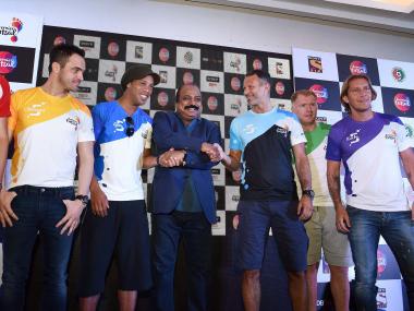 Ronaldinho, Ryan Giggs, Paul Scholes, Michel Salgado, and Falcao in Chennai. PTI[/caption] The other marquee players are another Manchester United stalwart Paul Scholes and former Galactico Michel Salgado. Falcao or Alessandro Rosa Viera is known as ‘Pele of Futsal’. Friday’s opening ceremony will see a live performance from music maestro AR Rahman, who produced and sang official anthem of the league. International futsal freestylers led by Sean Garnier will also showcase their skills and give the audience a glimpse of what to expect from the first edition of Premier Futsal. Futsal is a form of football played indoors on a smaller fields with five players in a side for 40-minute duration. Premier Futsal is a franchise-based tournament promoted by an entity formed by Indian entrepreneurs. It has Portuguese football legend Luis Figo as president and Indian cricket star Virat Kohli as ambassador. The competition will move to Goa on 18 July. The final will take place in Goa on 24 July. The first edition will see six franchises divided in two groups to battle it out over eight match days and 13 matches. Each franchise was assigned a marquee international football player, seven international and five Indian futsallers. The six teams are split into two groups of three each, with Chennai, Mumbai and Kochi forming Group A and Group B featuring Goa, Kolkata and Bangalore. The tournament is split up over two legs to be played in Chennai and Goa. There will be three days of futsal in Chennai, from 15-17 July, featuring six matches with two being played each day at the Jawaharlal Nehru Indoor Stadium. After a day’s rest, the tournament resumes in Goa, at the Peddem Sports Complex in Mapusa. The remaining six group stage encounters will be played there from July 19-21, before another day’s rest ahead of the knockout round. The semifinals and finals will be held in Goa on 23 July and on 24 July. Sony Pictures Networks, which acquired the broadcast rights for the league, will start live telecast from 6.50pm onwards on Sony SIX, SONY ESPN and Sony AATH. At the pre-tournament press conference, Ronaldinho said he was feeling good to be back in India amongst a passionate and kind audience. “It will be unique experience to be playing against the best futsallers and my friends who I have played against in the past. I am delighted to back in a playing capacity this time and I would like to thank Premier Futsal for bringing back my memories from childhood of playing Futsal back home,” Ronaldinho said. Chennai 5’s captain Falcao, who replaced Portuguese Deco at last minute because of injury, said, “Especially for the 5 kids who are a part of each team this could be a phenomenal learning experience. A lot of them would be playing alongside their sporting heroes and that should in itself be enough motivation to before to the best of their abilities and learn something from this Premier Futsal experience.” “I am honoured to sitting alongside this elite bunch of players and be playing against them in this debut season of Premier Futsal. This is a great concept and team have in mind to have legends from football, my colleagues from the Futsal world and these young Indian kids as a part of team,” he said. Mumbai 5’s captain Ryan Giggs said Premier Futsal will be a different experience for me. “I would love to see how I fare amongst the best in the business of Futsal. Several countries across the world are now embracing Futsal at the academy level to improve the game of kids at a very young age. I am delighted that entrepreneurs in India could think of this concept of Premier Futsal and manage to put together all these Futsal players and of course, all these legends who I have grow up playing with,” said Giggs. Paul Scholes, marquee player and captain of Bengaluru 5’s said he was surprised at the number of people who turned up at the airport to welcome the captains of six teams. “I was totally surprised at the number of people who turned up at airport to welcome us. I was told there are a lot of Manchester United fans here, but I was pleasantly surprised to know that it was beyond my expectations,” he said. “Through Premier Futsal, I hope we can showcase the importance of Futsal as a sport to the Indian fans. The thought of having the Indian players as a part of the playing team showcases the intent of the promoters to encourage the youth to take up Futsal. All of us here sincerely hope we can put together a season which will encourage more youngsters to come forth and pick up the sport as a profession.” Argentine forward Hernan Crespo, marquee player of Kolkata 5’s, said, “I was delighted to see the preparedness with which they went about planning Premier Futsal and as a businessman myself, their conviction led me to believe this is could be a start of something really special in India. I am glad to be here and be playing in the inaugural edition of Premier Futsal.”