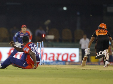 Carlos Braithwaite’s run-out of Shikhar Dhawan was a wonderful moment of of destructive wizardry. BCCI[/caption] David Warner, in his post-match interview, was quick to put his finger on the difference between the two sides on the night: The fielding. In any match that keeps the spectators and viewers hooked throughout, and the result in doubt until the very last ball, there are naturally many moments one can look back upon as having made the difference. In this particular match, and putting aside for one moment Karun Nair’s excellence and heroics, we must acknowledge that it were two fantastic pieces of fielding from the Daredevils that laid the foundation for the victory. The Sunrisers started well, skipper David Warner yet again dominating with the bat. In any other season than this record-breaking one for Virat Kohli, we would be acclaiming Warner as the league’s best batsman. He and Shikhar Dhawan had put 42 on the board in the first five overs, and this despite opposing captain Zaheer Khan only conceding eight runs from his two overs. But Jayant Yadav and Nathan Coulter-Nile had been tucked into, so Zaheer had to turn elsewhere. With Chris Morris out injured, the Daredevils recalled a player absent for much of this T20 season: Barbados and West Indies’ Carlos Brathwaite. Remember the name? His first over stemmed the flow, but it was his reactions rather than his bowling that made us jump up from our seats. Early in the over, he dropped a sharp, tough caught and bowled chance offered by Warner; but when Dhawan offered him a different kind of opportunity off the over’s final delivery, he pounced with alacrity. The Sunrisers opener drove back a fierce shot heading towards mid-on, but the big outstretched left hand of the Bajan stopped the ball in its path as he dived full-length upon it; and then pivoting, he transferred the ball to his throwing hand, his right, and with a whirlwind, whistling throw, hurled down Dhawan’s stumps with the batsman still moving forward out of his crease with the propulsion of the stroke. It was a wonderful, dramatic, free-flowing piece of destructive wizardry. The previous day we had seen a not dissimilar moment of fielding genius from Shadab Jakati — but this from Brathwaite topped it. Reaching back into my memory bank, the only thing I can recall even better was Roger Harper’s astonishing