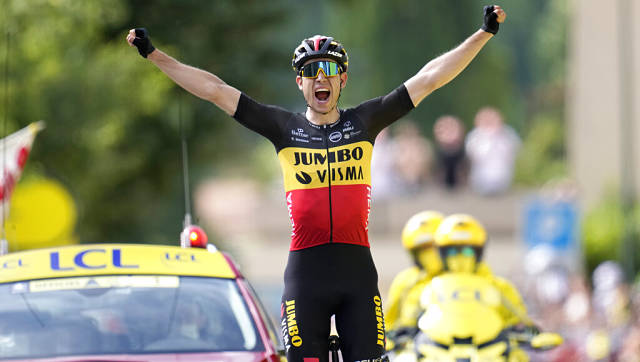 Belgian champion Wout van Aert twice conquered the daunting and gruelling Mont Ventoux to win the prestigious Stage 11 of the Tour de France on Wednesday. Van Aert was part of a breakaway that formed in the early stages of the nearly 200-kilometers trek in southern France featuring an unprecedented double climb of the iconic mountain known as the “Giant of Provence." “I know I’m not the best climber, but when I pick my day I know I have my chances," said Van Aert. Race leader Tadej Pogacar was fourth, one minute and 38 seconds behind, and kept the yellow jersey. The defending champion was briefly dropped by Jonas Vingegaard near the summit in the second ascent of the iconic mountain but erased the 38-second deficit in the downhill. Pogacar has an overall lead of five minutes and 18 seconds over Rigoberto Uran, with Vingegaard in third place, 5:32 off the pace. At 26, Van Aert is a jack of all trades. He can sprint, climb and time trial, but did not fight for the general classification, working in support of Jumbo-Visma leader Primoz Roglic. The former cyclo-cross world champion was given more leeway by his team after Roglic retired from the Tour last week, setting his sights on a stage win. Van Aert went solo during the second ascent of the Ventoux, about 11 kilometers from the summit, opening a big gap with his breakaway companions. He kept his lead intact in the long downhill to the finish line, smiling to TV cameras and clenching his fist as he approached the town of Malaucene. He then raised on his pedals and yelled in triumph with his arms stretched. It was van Aert’s fourth career stage win at the Tour. The Ventoux is part of the Tour’s lore. It was the site of an incredible scene back in 2016 when four-time champion Chris Froome had to briefly run toward the summit after he damaged his bike in a crash. An epic contest between Lance Armstrong and Marco Pantani in 2000 also took place on the slopes of the “Bald Giant,” where British rider Tom Simpson died in 1967 from a combination of amphetamines and alcohol. The stage got off to a lively start as world champion Julian Alaphilippe broke away with Nairo Quintana, but the Colombian climber could not follow his pace and got dropped. Alaphilippe was joined by a group of three riders and created a three-minute lead over the main pack across the vineyards and rolling landscape of the Luberon region. Behind the quartet, a group of counter-attackers chased hard in the first big climb of the day, the Col de la Liguière, but could not fill the gap. In sizzling hot weather, Pogacar rode in the main pack with his yellow jersey wide open. Others tried to cool down with small bags of ice cubes applied to their necks. The downhill from La Liguière led the breakaway to the town of Sault and the start of the first ascent of the Ventoux via a 22-kilometer climb. They were joined at the front by the chasing group as the real suffering began. The leading pack split with Alaphilippe and six others, including Van Aert, moving away 12 kilometers from the summit surrounded by hordes of excited fans. Riding in rarefied air, Alaphilippe was first to reach the barren summit, where swirling cloud added to the ominous lunar-looking landscape. Paced by 2018 champion Geraint Thomas and his Ineos Grenadiers teammates, the peloton struggled to cut the gap. Alaphilippe was clocked at a top speed of 99 km/h (61.5 mph) on the descent. Julian Bernard took over the lead as the group went back for its second ascent of Mont Ventoux, a shorter but steeper climb compared to the first. Kenny Elissonde attacked alone but his move was countered by Van Aert.