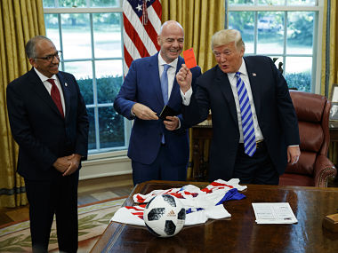 Washington: President Donald Trump welcomed FIFA boss Gianni Infantino to the White House on Tuesday, congratulating football’s governing body for awarding the 2026 World Cup to North America before jokingly waving a red card at journalists. “I very much appreciate the fact that we have won a very important event, the World Cup in 2026,” said Trump, who had backed the joint USA-Mexico-Canada bid which triumphed over Morocco at a vote in Moscow on June.