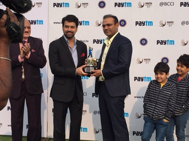 New Delhi: Virender Sehwag, who recently retired from international cricket, thanked his former India captains Sourav Ganguly, Rahul Dravid, Anil Kumble along with iconic Sachin Tendulkar for their guidance during his illustrious international career. Sehwag, however, did not mention the name of Mahendra Singh Dhoni, under whom he played for the national team for almost six years. The BCCI on Thursday formally felicitated Sehwag before the start of the fourth Test match against South Africa with secretary Anurag Thakur presenting him with a glittering trophy for his achievements. [caption id=“attachment_2531424” align=“alignleft” width=“380”]  Anurag Thakur felicitating Sehwag at Kotla. Twitter @BCCI[/caption] Sehwag was accompanied by his mother Krishna Sehwag, wife Aarti and two sons Aryavir and Vedant during the short ceremony. In his brief farewell speech, Sehwag thanked everyone from BCCI to DDCA to his first coach AN Sharma and Satish Sharma, who first picked him for Delhi U-19s. “I want to thank my father for allowing me to play the game of cricket and give me freedom to do whatever I wanted to. All my coaches, especially AN Sharma for making me the cricketer I am,” the 37-year-old said. He also had words of gratitude for his close friends, including Delhi U-19 coach Raju Sharma. When it came to the captains, Sehwag said: “I want to thank my first captain Ajay Jadeja and other captains Sourav Ganguly, Rahul Dravid, Anil Kumble. I want to thank Sachin Tendulkar.” There was no mention of Dhoni, though. Sehwag also mentioned about the contribution of the physios and trainers during his 14-year long career. In the end, he thanked the fans for “making him Sehwag”. “I would like to thank all my fans for standing by me in my good and bad times,” he said. While DDCA is yet to name a stand or gallery, the BCCI has temporarily named the far-end stand at the Ambedkar Stadium end as “Viru 319” after the batsman’s highest Test score. PTI