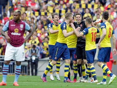 Arsenal retained the FA Cup in majestic style as their 4-0 demolition of Aston Villa in Saturday’s final made history for the Gunners and their manager Arsene Wenger. Wenger’s side swept Villa aside with a swashbuckling display sparked by Theo Walcott’s first half opener and illuminated by a sublime strike from Alexis Sanchez to double their lead after the interval. Per Mertesacker and substitute Olivier Giroud also got on the scoresheet for the rampant north Londoners to seal Arsenal’s second trophy in 12 months with the biggest margin of victory in an FA Cup final since 1994. [caption id=“attachment_2271324” align=“alignleft” width=“380”]  Arsenal celebrate after the final whistle. AP[/caption] It was a suitably memorable performance on a historic day which saw Wenger become the first manager in the post-War period to win the competition six times, a tally matched by only George Ramsey, who won the last of his with Villa in 1920. There was another significant slice of history for Arsenal as they lifted the famous old trophy for the 12th time, moving them ahead of Manchester United as the most successful club in the competition. Wenger insisted this week that he doesn’t know where he keeps his medals, but he now has a ninth major honour of his 19-year reign at Arsenal to add to the collection. “I am very proud. Our club is doing well and if I can personally do well then it’s even better,” Wenger said of his historic landmark. “We have shown that we are a real team and can deal with pressure. I congratulate the players, the staff and the fans. We are so happy.” Arsenal had conceded twice in a disastrous opening eight minutes against Hull in last year’s final. But there was no sign of such a fraught start this time as Arsenal quickly established their smooth passing rhythm to pen Villa deep inside their own half. Sanchez was at the heart of all their best moments and he worked space to clip a cross towards Laurent Koscielny, whose header forced a fine one-handed save from Shay Given. Aaron Ramsey should have scored when a fortunate deflection presented him with a clear sight of goal just inside the penalty area, yet the Arsenal midfielder couldn’t hit the target with a rushed effort. Villa, appearing in their first FA Cup final since 2000, seemed completely bewildered by the speed and movement of Arsenal’s attacks. They were prised open when Mesut Ozil’s ball in the six-yard box was met by Walcott with a lunging volley that looked goalbound until Kieran Richardson threw himself into a last-ditch block. Inspired switch Walcott had been preferred to Giroud in the central striker’s role that he has spent years telling Wenger he could thrive in, but the Arsenal boss responded to that miss by shifting the winger to the left flank and moving Sanchez into the middle. It proved an inspired switch as the pair combined to break the deadlock in the 40th minute. Once again, a blur of Arsenal passes went unchecked by the bedraggled Villa rearguard before Nacho Monreal lofted a cross that was bravely headed back across goal by Sanchez. With Villa’s defenders too slow to react to the danger, Walcott pounced, arriving unmarked from the left to lash a ferocious left-foot shot past Given. Walcott’s seventh goal of an injury-ruined season was no more than Arsenal deserved and, with their confidence now sky-high, they took just five minutes after half-time to press home their advantage. While Walcott has been a bit-part player for most of the campaign, Sanchez has established himself as Arsenal’s creative fulcrum in the nine months since he arrived from Barcelona and he capped his debut season with a stunning effort in the 50th minute. Seizing possession in a wide position 25 yards from goal, a typically deft drop of the shoulder send two Villa defenders the wrong way, buying time and space for Sanchez to unleash a superb, swerving shot that flashed over the flat-footed Given into the roof of the net. Villa, so vibrant since Tim Sherwood took over late in the season, looked traumatised by Arsenal’s scintillating display. Mertesacker compounded their misery in the 62nd minute when the Gunners defender guided a corner into the net via his shoulder before Giroud’s clever flicked finish in stoppage-time underlines the class divide between the teams. AFP