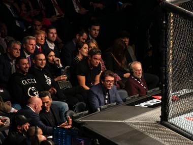 President Donald Trump watches as Derrick Lewis fights Blagoy Ivanov at UFC 244 at Madison Square Garden in New York. AP[/caption] Trump sat around 15 feet away as UFC fighters delivered vicious kicks and punches to the face and body of their opponents, regularly drawing blood, at Madison Square Garden. The President was seen clapping and at one point stood up for a better view as 20,000 pumped-up fans screamed and swore amid an electric atmosphere at the pay-per-view spectacle. Jeers rang out as Trump, wearing a dark suit and red tie, punched his fist and waved at the crowd as he walked into the arena shortly before 10pm. Many fans also cheered the US leader and there was no repeat of the loud chants of “lock him up” that greeted his appearance at a World Series baseball game last weekend. “We’d be having more fun if he wasn’t here,” 50-year-old Anna Torres, who booed loudly with her boyfriend, told AFP. Some spectators, however, were delighted to see the President, who has a fight of his own on his hands back in Washington with the Democrats’ bid to impeach him. “It’s disrespectful to boo because he is our President,” said Nico Ferranti, 30, adding that he was unsurprised to see the President turn up. “He’s from New York and he likes this kind of stuff. Back in the day he was on Wrestlemania,” said Ferranti, referring to Trump’s infamous scripted bodyslam of WWE President Vince McMahon in 2007. Several dozen protesters carrying placards with slogans such as “Trump/Pence Out Now!” and “Headlock Him Up”, in reference to a UFC move, demonstrated outside the Manhattan venue.