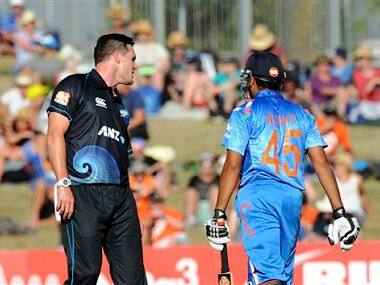 Hamilton: New Zealand pacer Mitchell McClenaghan said his team will look to play aggressive cricket in the ongoing ODI series against India to send a message to the other powerful nations. “These guys are good players but at no point are we going to back away from a fight,” said McClenaghan, who had a slight verbal confrontation with Indian opener Rohit Sharma in the opening one-dayer in Napier which the Kiwis won by 24 runs. [caption id=“attachment_1350717” align=“alignleft” width=“380”]  New Zealand’s Mitchell McClenaghan got his team the vital wickets in the first ODI. AP[/caption] “We’re not going to be nice to them, we’re going to get in their face and let them know that we’re here and we’re going to put our mark on the buildup to the World Cup.” New Zealand have a 1-0 lead in the five-match ODI series and McClenaghan hoped some good showings will send the right message to other top teams. “It’s a huge series against one of the best sides in the world. Leading into a World Cup in our back yard we want to have consistency,” McClenaghan was quoted as saying on a website. “This is our best team that we can put out on the park. Hopefully we can let everyone know around the world that in our own back yard on our grounds and our decks we’re not to be taken lightly come 2015.” India will take on New Zealand in the second one-dayer here tomorrow. PTI