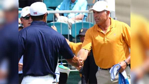 Melbourne: Tiger Woods and his former caddy Steve Williams moved to defuse tension early in the Presidents Cup, shaking hands at the first tee at Royal Melbourne Golf Club before their group’s opening foursomes match Thursday. Williams, who now carries International player Adam Scott’s bag after Woods fired him in July, sparked a global controversy in the leadup to the biennial tournament by making a racist remark about Woods in China earlier this month. [caption id=“attachment_133141” align=“alignleft” width=“380” caption=“Tiger Woods and his former caddy Steve Williams (R) moved to defuse tension early in the Presidents Cup, shaking hands at the first tee at Royal Melbourne Golf Club before their group’s opening foursomes match Thursday. Ryan Pierse/getty Images”]  [/caption] US captain Fred Couples Wednesday put an end to days of intense media speculation by naming Woods and playing partner Steve Stricker to play Australian Scott and South Korea’s KJ Choi in a move he said was not premeditated. After greeting and shaking hands with Williams to a smattering of applause from surrounding spectators, Woods split the par-four fairway with his tee-shot. Woods is making his seventh Presidents Cup appearance as the US bid to win their fourth successive trophy, though Royal Melbourne is the venue of their sole loss in 1998. Reuters