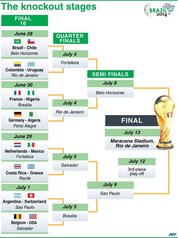 The group stages have ended and 16 teams have returned home — the other 16 still in Brazil to slog it out in the knockouts. Here’s a quick look at who will play who and how they got there.  28 JUNE Brazil vs Chile So it’s going to be Brazil against Pele’s favourites for the World Cup - Chile. Brazil got lucky in their opening game against Croatia and then battled Mexico in an entertaining 0-0 draw before turning on the style against Cameroon, beating them 4-1 with Neymar getting two. Chile dispatched Australia comfortable in their opener before shocking Spain and sending them tumbling out of the World Cup. Their dogged approach has garnered admiration and they almost held on against Netherlands before succumbing to the brilliance of Arjen Robben and losing 0-2. [caption id=“attachment_1590461” align=“alignleft” width=“380”]  Uruguay will face Colombia. AP[/caption] Colombia vs Uruguay: Uruguay’s journey to the last 16 was kickstarted by Luis Suarez’ brilliance against England and ended with his darker side overshadowing their win over Italy in the last group match. It remains to be seen whether they will have their talisman on the pitch for the match against Colombia, who have won all their matches so far (vs Greece, Ivory Coast and Japan). Colombia’s young team has attacked with great intent and rely on James Rodriguez and Jackson Martinez for their goals — so Uruguay better be wary. 29 JUNE Mexico vs Netherlands: The Dutch crushed Spain 5-1 in their opener and are riding high on the form of Robben - who is sending constant reminders to the world that he is the fastest player at the tournament. With Robin van Persie back from suspension, it will be a full strength Netherlands who will take an inventive and organised Mexico — who beat Cameroon and Croatia to reach the last 16. Mexico can get stuck in and will not be pushovers — but The Oranje have momentum on their side, winning three out of three in the group stage. Greece vs Costa Rica: Nobody thought the Greeks would still be alive in the tournament but they clearly shed their ‘boring’ tag when they drove forward in numbers against Ivory Coast in the last group match — winning in the dying seconds courtesy of a Giorgos Samaras penalty. With their backs to the wall, they can be a formidable opposition but are against a team who have beaten Uruguay and Italy and drew with England to reach this stage. Costa Rica have been the surprise package of the tournament so far and there is nothing lucky about that — they’re just playing brilliant football. 30 JUNE France vs Nigeria: If that Nigeria vs Iran 0-0 was anything to go by, then France could have considered this match in the bag. But in their 2-3 loss to Argentina, they showed that they are a team dangerous on their break and when on song, can score. Ahmed Musa is their danger man but it’s a physical side and France can expect a lot of balls in the box and some rough challenges. France on the other hand have been one of the best attacking sides of the World Cup so far. They drew 0-0 against Ecuador but have a balanced side who play a brand of good direct football. With two wins (3-0 vs Honduras and 5-2 vs Switzerland) and a draw, they’ve clearly gotten over their 2010 nightmare. Germany vs Algeria: Germany started their campaign with a 4-0 thumping of Portugal before coming up against a powerful Ghana (2-2) and beating USA 1-0 in a cagey affair. The Algerians have had a more adventurous campaign and are riding high on making history – entering the WC knockouts for the first time after a hard-fought draw against Russia. They were not too bad in their opening defeat to Belgium, leading the dark horses before conceding two late goals and showed some excellent movement in their 4-2 win over Korea. But they’ve hardly met top top opposition in the World Cup so far and Germany are just that. 1st JULY Argentina vs Switzerland: Switzerland’s star-man Xherdan Shaqiri finally got going in their 3-0 win over Honduras and they will hope he starts off from where he left off when they face Argentina. Lionel Messi is in the groove now, scoring two spectacular goals to give his side 1-0 wins over Bosnia-Hercegovina and Iran before curling in a glorious freekick against Nigeria. Slowly and steadily, Argentina are getting the hang of playing in Alejandro Sabella’s 4-3-3 and it would be shocking if they lost to an inconsistent Swiss side (won vs Honduras and Ecuador, lost to France in group stage). Belgium vs USA: The highly rated golden generation of Belgians have looked out of sorts and made slow starts in each of their three wins (2-1 vs Algeria, 1-0 vs Russia and 1-0 vs Korea) — a slightly flattering set of results considering how they’ve played so far. Hopefully the nerves will have gone before they take on USA, who managed to squeeze through to the last 16 despite a loss to Germany in their last group match. But a win over Ghana and draw against Portugal has injected a lot of belief in this USA team — something they’ve been banking on since the start of the tournament.