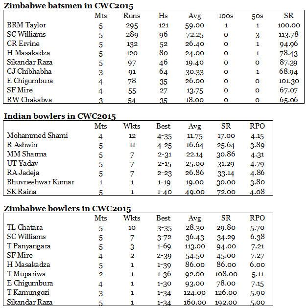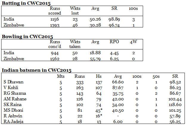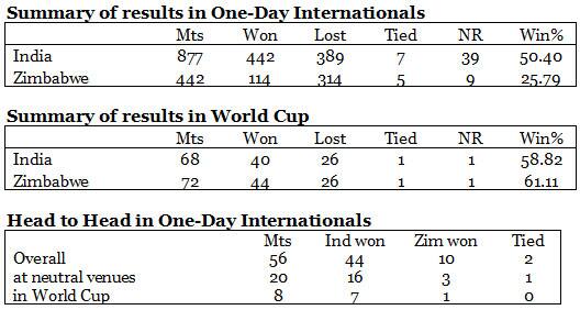 For Team India, it’s about keeping up their momentum before the quarterfinals. AFP[/caption] MS Dhoni sounded reluctant to rest any players and it seems unlikely that he will change the playing XI or his strategy — but this could be seen as a last chance for the likes of Rohit Sharma and Ravindra Jadeja come good. Dhoni has been particularly critical of the latter, and even though he is seen as a trusted lieutenant, his performances have come under the scanner. The 33-year-old has already matched Clive Lloyd’s record of leading a side to nine consecutive World Cup wins, and has surpassed Sourav Ganguly’s record of eight consecutive wins. Below is a complete lowdown on the statistics that matter ahead of facing Zimbabwe: