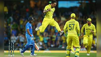 Mitchell Johnson celebrates after taking the wicket of Rohit Sharma during the 2015 Cricket World Cup Semi Final at the Sydney Cricket Ground on March 26, 2015. The co-hosts beat India by 95 runs. (Photo by Mark Kolbe/Getty Images)