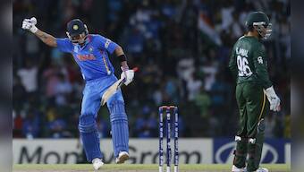 Virat Kohli, second right, celebrates taking the wicket of Pakistan's captain Mohammad Hafeez, left, as Shoaib Malik, right, looks on. Eranga Jayawardena/AP