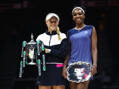 Singapore: Former World No 1 Caroline Wozniacki ended her career-long jinx against Venus Williams in spectacular style to lift the WTA Finals trophy for the first time on Sunday. The Dane had won just one set in seven harrowing defeats to Williams but she turned the tables with a 6-4, 6-4 victory in 89 minutes at the Singapore Indoor Stadium. [caption id=“attachment_4182865” align=“alignleft” width=“380”]  Caroline Wozniacki and Venus Williams pose with their trophies. Image courtesy: Twitter @WTA[/caption] Wozniacki had some nervy moments after 37-year-old Williams, the tournament’s oldest ever finalist, clawed her way back from 0-5 down in the second set. But she kept her cool to seal the victory with a backhand down the line, throwing her racquet into the air and holding her hands to her face in disbelief. “I am so happy I managed to win in the end,” said Wozniacki, describing the victory as “really sweet”. “Eight is my lucky number. If I was going to beat her (Williams) once in my career, it had to be today. “I couldn’t be happier right now. It’s been an amazing year. Last year was tough with injuries but I fought my way back and to stand here and win the title means a lot to me.” Wozniacki has been in brilliant, aggressive form in Singapore, beating Elina Svitolina and Simona Halep at the group stage and Karolina Pliskova in the semi-finals. After an even start, she seized control of the final by breaking four straight times across the sets to lead 5-0 in the second set. With the title in her sights, Wozniacki was unable to serve it out in the seventh game and the ninth, when Williams produced an astounding crosscourt winner to win her fourth straight game. But Wozniacki finally triumphed in the 10th game with her backhand down the line. She will now be third in the year-end rankings, after starting the tournament at sixth. Contrast of styles Williams looked increasingly weary as the match wore on after playing a gruelling, three-set semi-final against Caroline Garcia on Saturday. “I didn’t seem to come up with my best tennis until it was too late,” the American said. “I love being here, it is an honour. Only eight players get to be here and I hope to return.” In a contrast of styles, counter-puncher Wozniacki tried to extend the rallies while her big-hitting opponent attempted to shorten points through sheer power and rushes to the net. Wozniacki broke three times in the first set and took a one-set lead when Williams played a loose service game at 4-5 down – just she second set she had ever conceded to the Dane. Wozniacki, in her first WTA Finals since 2014, flourished in Singapore, with a tough three-set defeat to Caroline Garcia her only slip-up. It completed a stellar comeback season for the two-time Grand Slam finalist, who endured an injury-marred 2016 and finished ranked number 19, her lowest position since 2007. Williams was denied a 50th career triumph and first for the year, having finished runner-up at the Australian Open and Wimbledon. She will remain the world number five after playing in her first WTA Finals since 2009. Earlier, world number three pairing Timea Babos and Andrea Hlavackova won the WTA Finals doubles title on debut with a 4-6, 6-4, 10-5 comeback victory over Kiki Bertens and Johanna Larsson.