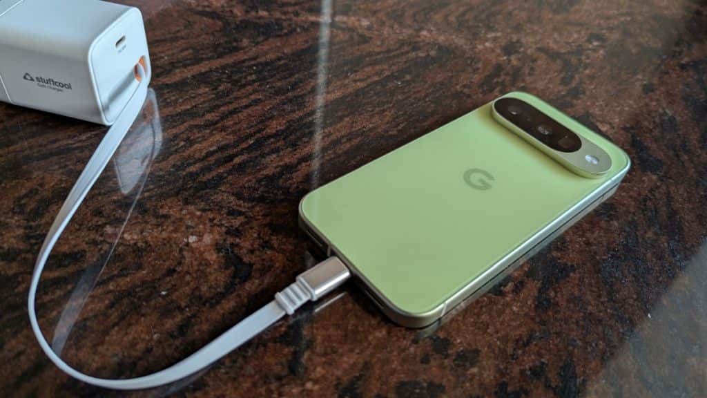 We tried a bunch of third party 30W USB-PD chargers all the way up to those with 65W output. We eventually settled on the Stuffcool Zeno, a neat little 30W GaN charger with built-in retractable USB-C cable as well as another USB-C port that can provide 30W USB-PD output too (not if you use both outputs simultaneously though). The retractable cable option is damn cool and the charger weighs less than 100 grams, making it a great travel companion. It also provided the joint fastest time we clocked for charging the Pixel 10 from 1% to 100%, which was a whole 96 minutes.