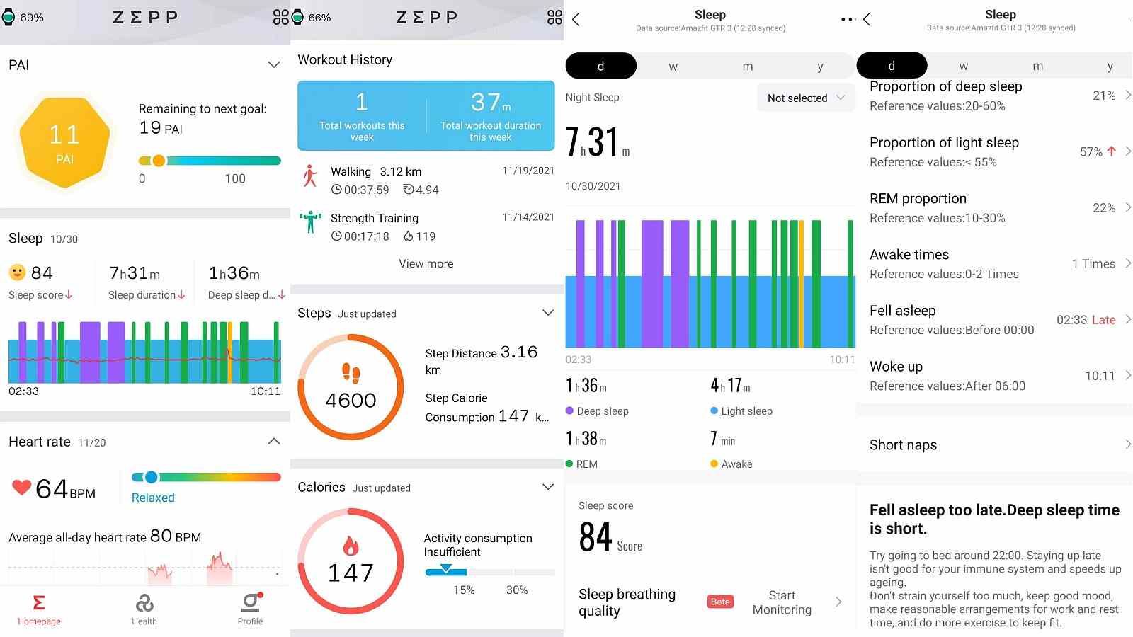 New BioTracker PPG 3.0 biometric sensor can monitor heart rate, blood oxygen, stress levels and sleep. Image: Tech2/Ameya Dalvi[/caption] The company claims that this watch can auto-detect eight workouts including indoor and outdoor walking, but neither worked for me. Even after 30 minutes of walking, the particular workout did not start automatically. All the fitness data is available in the Zepp app with a neat daily, weekly and monthly breakdown of various fitness activities you indulged in. It also displays a weekly PAI (Personal Activity Intelligence) score, that gives you an idea of how active you have been during the period. The goal is to score 100 points each week. Sleep tracking works well here. The overall sleep duration from the time I fell asleep till I woke up seemed perfect. It tracks the quantum of light sleep, deep sleep, REM periods and awake time. Unlike GTR 2, the REM sleep information is available here from the get-go. You get a sleep score and some advice based on the quality and quantity of sleep. You can also measure your stress levels manually or set it to all day monitoring. Stress is calculated on the basis of your heart rate variability. There are a lot more interesting features for you to explore on this watch, but I will stop here to keep the length of this review in check.
