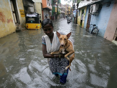 A woman carries a dog as she wades through a water-logged by-lanes in Chennai. Reuters.[/caption] The project is being implemented under the supervision of a high powered committee led by former Secretary of