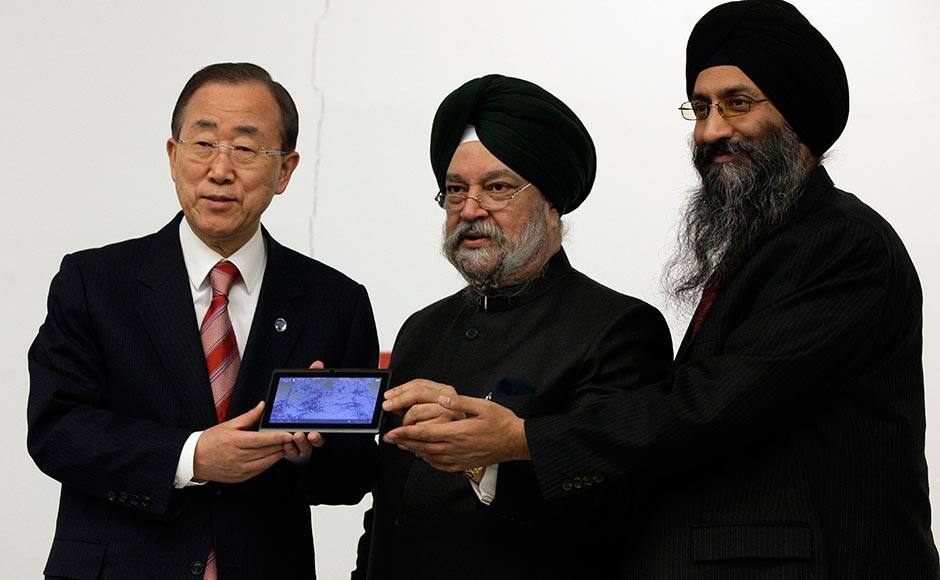 [caption id=“attachment_541153” align=“alignleft” width=“940”]  (Read their lips! Ban Ki-moon to Tuli: Are you sure its working?) Suneet Singh Tuli, right, CEO of Datawind, presents UN Secretary General Ban Ki-moon, left, an Aakash2 tablet computer during a meeting at the United Nation headquarters. They are accompanied by India’s UN Ambassador Hardeep Singh Puri. Richard Drew/AP[/caption]