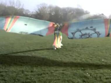 The 31-year-old, is seen running through a park in the Hague, flapping his huge kite and carbon ‘wings’ before he appears to lift off and cruise for a minute, travelling 300 feet through the air.