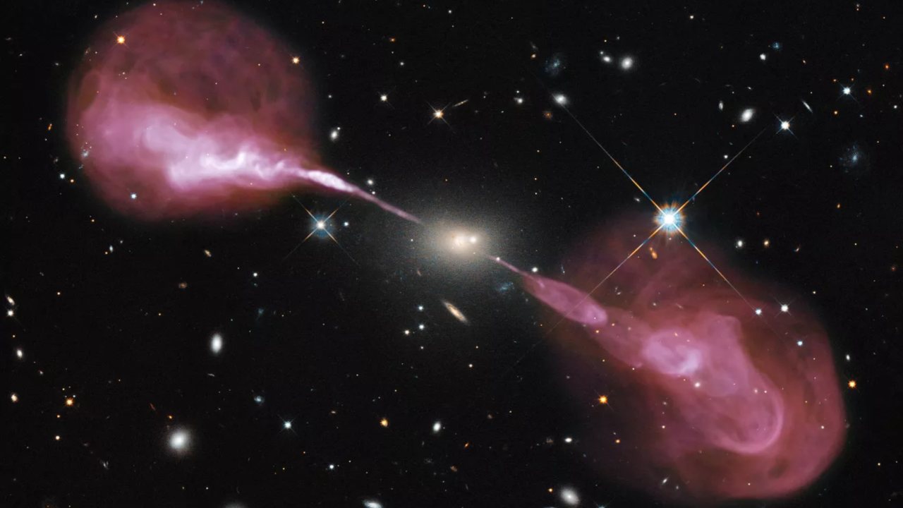Jets of energy and matter being thrown out from the centre of the Hercules A galaxy, at nearly the speed of light. This demonstrates the awesome destructive power of black holes [artistic concept based on Hubble data]. Image: NASA/JPL-Caltech